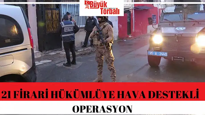 İzmir Emniyet Müdürlüğü ekipleri, haklarında yakalama emri bulunan kişilere yönelik belirlenen adreslere eş zamanlı helikopter destekli baskın düzenledi. Operasyonlarda, hırsızlık, yaralama, cinsel saldırı, yağma, kullanmak için uyuşturucu madde bulundurmak, Vergi Usul Kanunu'na muhalefet, kişiyi hürriyetinden yoksun kılma, iftira, resmi belgede sahtecilik, ateşli silahlar ve bıçaklar kanununa muhalefet ve marka hakkına tecavüz suçlarından haklarında hüküm toplam 21 hükümlü yakalanarak cezaevine gönderildi.