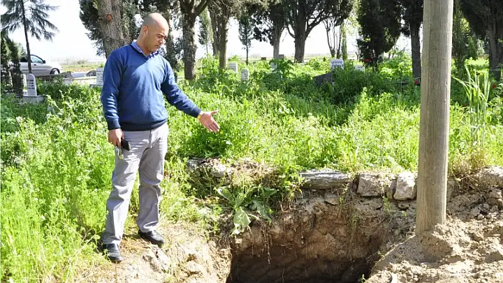 Subaşı Mahallesi'ndeki mezarlıktaki bir kabir, üç gün önce altın diş için defineciler tarafından kazıldı. Kazılma sonucu etrafa kemik parçaları saçıldı.