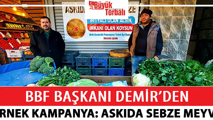 Geçtiğimiz hafta kurulan Birlik Beraberlik Federasyonu Torbalı İlçe Başkanlığı, faaliyetlerine hızlı başladı. Askıda meyve-sebze kampanyası başlatan İlçe Başkanı İbrahim Demir, ilk günden yoğun destek gördü