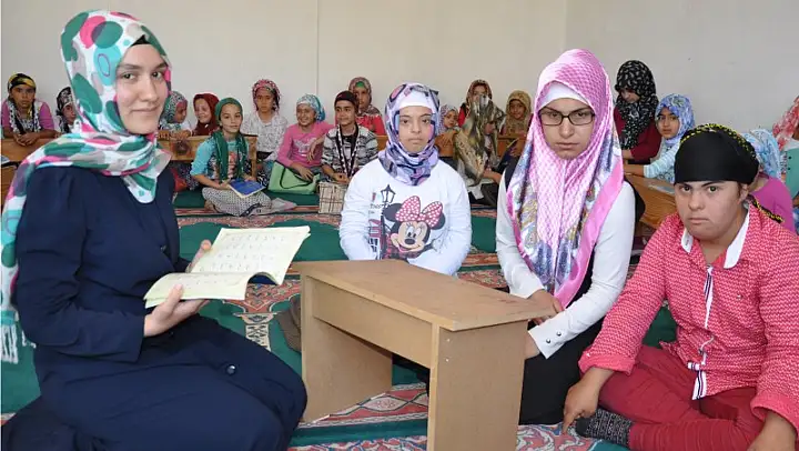DOWN sendromu 2 arkadaş ve 1 görme engelli bir kız çocuğunu Kur'an-ı Kerim kursunda görenler azimlerine hayran kalıyor: Her yıl okulların tatil olması sonrasında Diyanet İşleri Başkanlığı tarafından açılan Yaz Kur'an Kursları tüm hızıyla devam ediyor. Atatürk Mahallesi Ethem Oruç Camii'nde yaklaşık 500 öğrencinin eğitim gördüğü kursta, 3 öğrenci dikkatleri üzerine çekti. 15 yaşlarındaki down sendromlu Zeynep Bozdoğan ve Berfin Sucu ile yüzde 90 görme engelli olan Filiz Kara, Kur'an Kursu'na devam ederek dini eğitim alıyor. Kurs öğretmeni Derya Yalçın tarafından 3 engelli kıza özel eğitim veriyor.