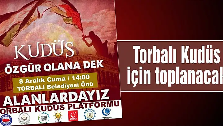 Bugün Torbalı'da da bir eylem var. Kudüs Platformu çatısında altında yapılacağı duyurulan eylem saat 14.00.te Torbalı Belediyesi önünde yapılacak. Yapılacak eyleme Kudüs Platformu çatısı altında Torbalı Belediyesi, Torbalı Ticaret Odası, Memur Sen, Anadolu Gençlik Derneği, Torbalı Kent Konseyi, AK Parti ve Saadet Partisi de destek veriyor.