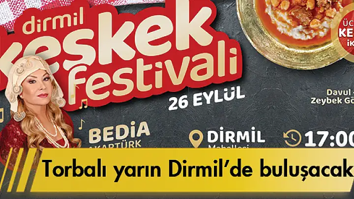 Dirmil'de düzenlenecek olan Keşke Festivali'ne yönelik Torbalı Belediyesi'nin sosyal medya hesaplarından 'Yöresel lezzetlerimizin tanıtılması amacıyla Dirmil Mahallemizde Keşkek Festivali düzenliyoruz. Festivalimizde Türk Halk Müziğinin usta ismi Bedia Akartürk konser verecek. Ücretsiz etkinliğimize tüm halkımızı bekliyoruz.' paylaşımı yapıldı. Belediyeden yapılan duyuruya göre sabah 10.00'dan itibaren başlayacak olan festivalde Bedia Akartürk 17.00 itibariyle sahne alacak. SİNAN TEKDEMİR