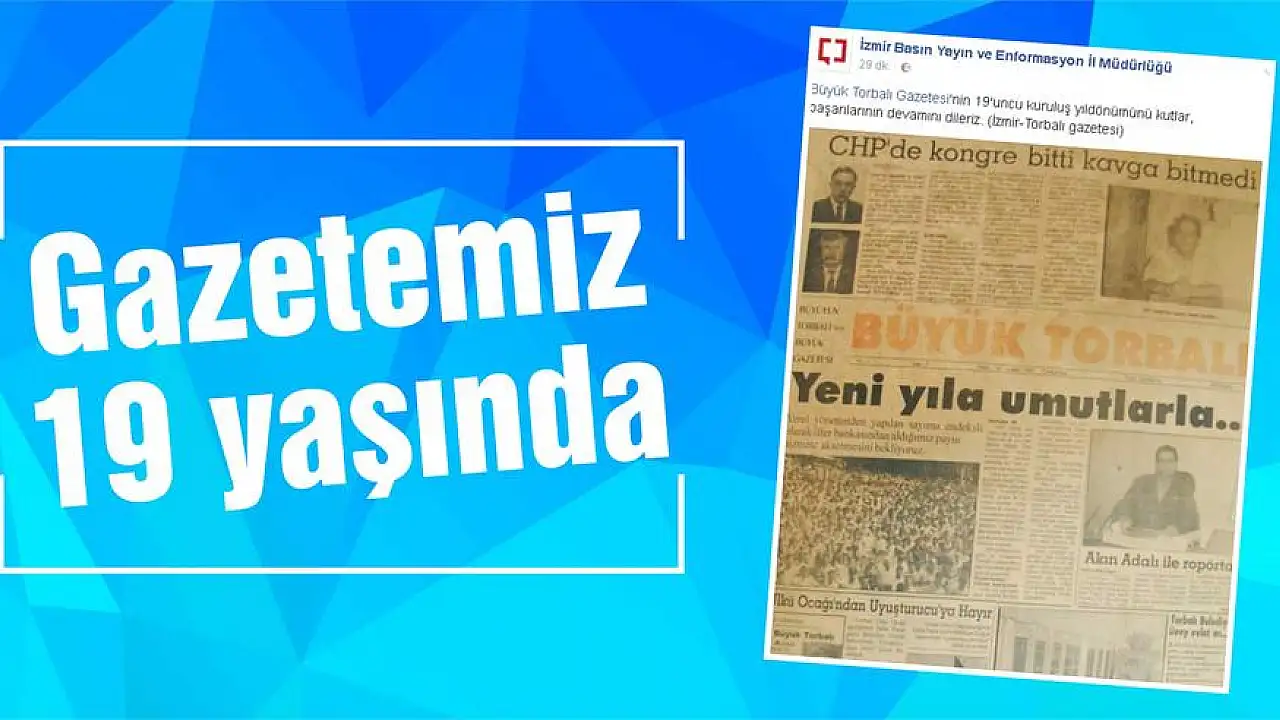 TORBALI’NIN ilk günlük yerel gazetesi Büyük Torbalı, bugün 19. Kuruluş yıldönümünü kutluyor. 19 yıldır tarafsız, objektif bir şekilde yayın hayatına devam ederek Torbalı ile birlikte büyüyen gazetemiz, bu anlamlı günde Basın Yayın ve Enformasyon İl Müdürlüğü’nden de tebrik aldı. Büyük Torbalı Gazetesi’nin 31 Aralık 1997 tarihli ilk nüshasını sosyal paylaşım sitesinde yayınlayan, müdürlük, “Büyük Torbalı Gazetesi’nin 19. Kuruluş yıldönümünü kutlar, başarıların devamını dileriz” notunu düşerek tebriklerini sundu.