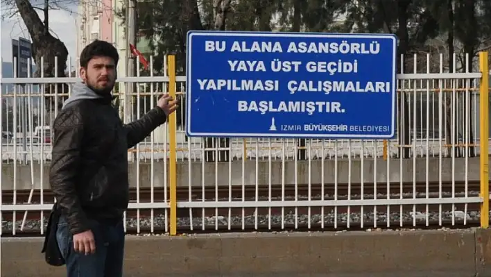İZBAN seferleri geçtiğimiz ay itibariyle başlamıştı. Günde ortalama 10 bin kişinin kullandığı seferler nedeniyle bazı kaçak noktalar kapatılmış, vatandaşlar Tepeköy, Ertuğrul ve Torbalı Mahallesi’ndeki alt ve üst geçitlerden karşıya geçmek zorunda bırakılmıştı. Trenin geçtiği bir diğer mahalle olan Cumhuriyet Mahallesi vatandaşları ise ya Ertuğrul ya da Torbalı Mahallesi’ndeki geçide kadar yürüyerek karşıya geçmeye çalışıyor. Gidecekleri yere kilometrelerce daha fazla yürüyerek gitmek zorunda kalan çoğu işçi ve öğrenci olan mahalleliler, büyük sıkıntılara mahkum edilmişti. Gazetemizin gündeme getirdiği sorun için Büyükşehir Belediyesi asansörlü bir geçidin yapılması için talimat vermiş. Tabelaları bile hazırlamıştı. Ancak tabelanın üstünde yazılan yazı ile ortada olan durum birbiriyle çok ters bir görüntüye neden oldu. Tepkilere de neden olan tabelada, “Bu alana asansörlü yaya üst geçidi yapılması için çalışmaları başlamıştır” yazısı vatandaşlarında kafasını karıştırdı. İhalesinin bile gerçekleşmediği öğrenilen geçidin ne zaman yapılacağı konusunda ise hala net bir bilgi bulunmuyor. İbrahim DANIŞ