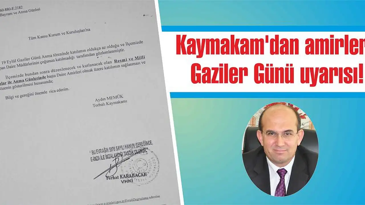 Gazilerin, kendileri için kutlanılan özel günlerinde yalnız bırakılmasına kızan İlçe Kaymakamı Aydın Memük, önceki gün büyün kamu kurum ve kuruluşlarına bir yazı gönderdi. Yazıda Memük, “19 Eylül Gaziler Günü Anma töreninde katılımın oldukça az olduğu ve ilçemizde görev yapan daire müdürlerinin çoğunun katılmadığı tarafımdan gözlemlenmiştir. İlçemizde bundan sonra düzenlenecek ve kutlanacak olan resmi ve milli bayramlar ile anma günlerinde başta daire amirleri olmak üzere katılımın sağlanması ve gerekli özenin gösterilmesi hususunda; bilgi ve gereğini önemle rica ederim” ifadelerini kullandı. İbrahim DANIŞ