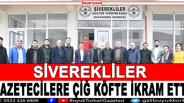 Torbalı Siverekliler Derneği 10 Ocak Çalışan Gazeteciler Günü vesilesiyle ilçede faaliyet gösteren gazetecilere dernek binasında çiğ köfte ikram etti. Dernek binasında gazetecilerle buluşan İzmir Şanlıurfa Federasyonu Başkanı Ferit Mızraklı ve Torbalı Siverekliler Kültür Yardımlaşma ve Dayanışma Derneği Başkanı Bahri Ağırtaş’a Siverekliler Derneği Başkan Yardımcısı İsmet Barlas ve diğer dernek yönetici ve üyelerinin yanı sıra Torbalı Muş-Bitlis Kültür Yardımlaşma ve Dayanışma Derneği Başkanı Sami Şirin de eşlik etti. 10 Ocak Çalışan Gazeteciler Günü vesilesiyle gerçekleştirilen buluşmada Torbalı Siverekliler Derneği Bahri Ağırtaş kendi elleriyle yaptığı çiğ köfteyi gazetecilere ve diğer konuklara ikram etti.