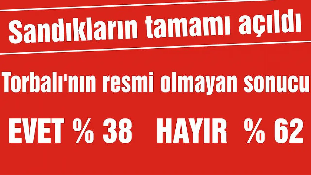 Türkiye Yüzde 51’in üzerinde bir oranla Cumhurbaşkanlığı Sistemi’ne ‘evet’ dedi. Torbalı’da ise sandıkların yüzde 100’ü açıldı. 322 sandıkta oy verme işleminin bitmesinden sonra hızlıca sayımlar gerçekleştirildi. Torbalı’da 117 bin 385 seçmenin 104 bin 727’si oy kullandı. Açılan sandıkların tamamından alınan rakamlara göre ‘Evet’ oyları yüzde 38,10 çıkarken, Hayır oyları ise yüzde 61,90 çıktı. Torbalılı 39 bin 264 vatandaş Evet oyu verirken, 63 bin 778 vatandaş ise tercihini Hayır’dan yana kullandı.