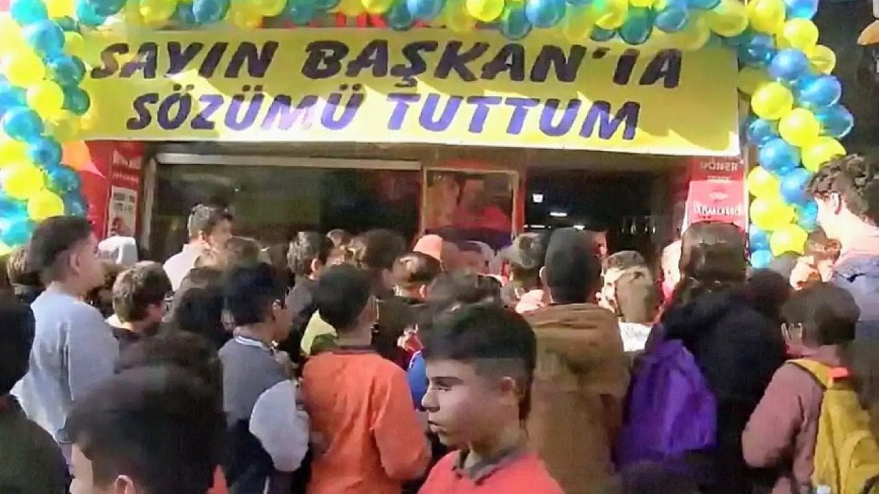 Döner dükkânı, güne özel sarı-lacivert balonlarla süslendi. “Sayın Başkanım, sözümü tuttum” yazılı afiş asıldı.